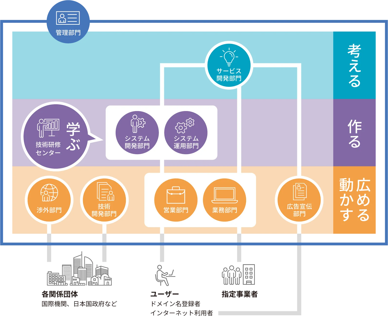 営業部門は、指定事業者に対して新サービスや施策を提案し、受けた要望を技術部門へフィードバックします。また、プロモーションの企画にも携わります。業務部門は、ドメイン名の登録受付や規則改訂を行い、ドメイン名の販売を希望する企業との面談や契約も担当。